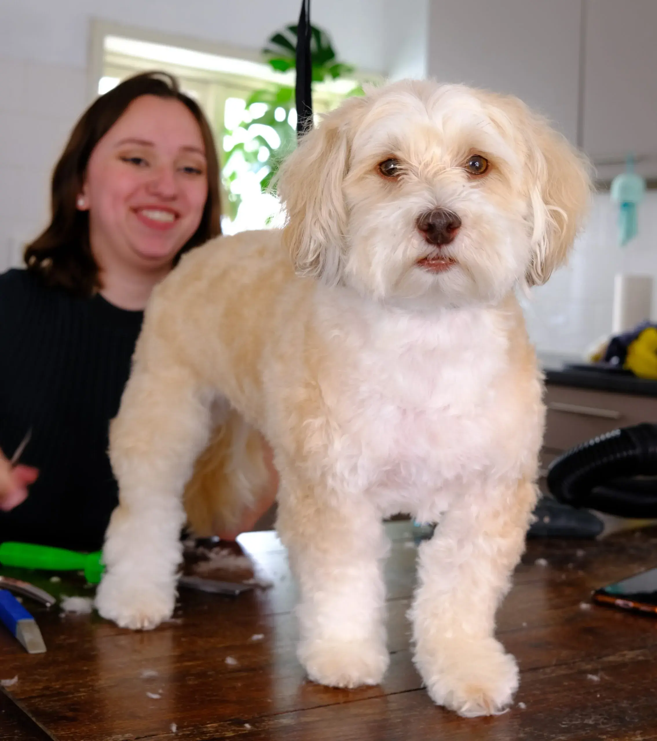 Bij een tussenbeurtje wordt de hond gewassen, gedroogd, oogjes vrij geknipt, voetjes rond geknipt en een sanitaire trim gedaan.
