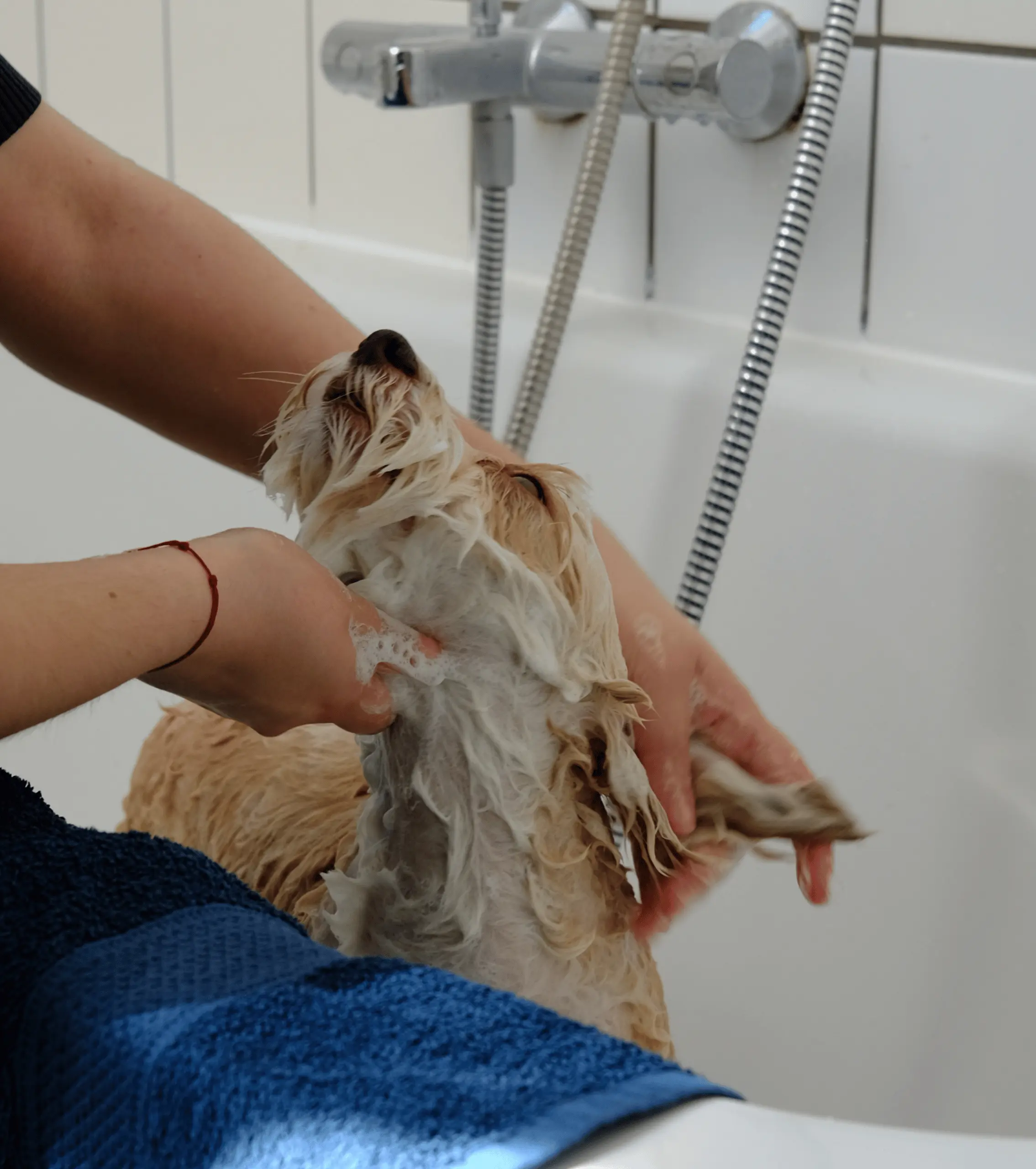 Ik vraag wel om een plekje met stromend water om uw hondje te wassen. Dat kan in bad, onder de douche of als u een erg klein hondje heeft ook in de wasbak van de keuken.