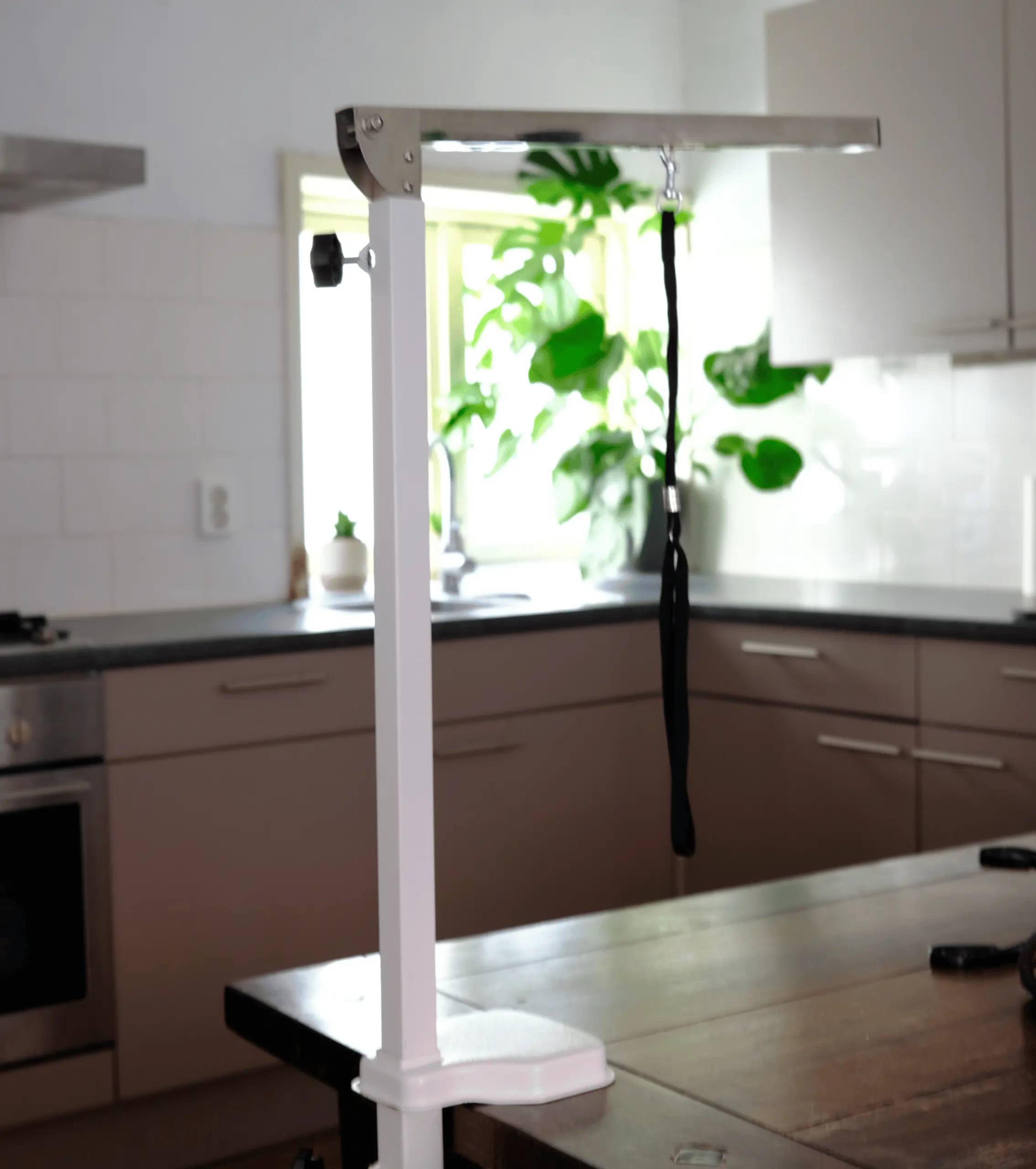 Dan heb ik mijn hondenblazer mee om het hondje snel weer droog te hebben om te kunnen trimmen. Ik neem ook een verstelbare tafelbeugel mee. Dit is om het hondje veilig vast te kunnen zetten. (zie foto). Hierdoor heb ik wel een tafel nodig waar deze beugel omheen kan. Een ongeluk zit in een klein hoekje en hiermee kunnen we de kans van een ongeluk verminderen.